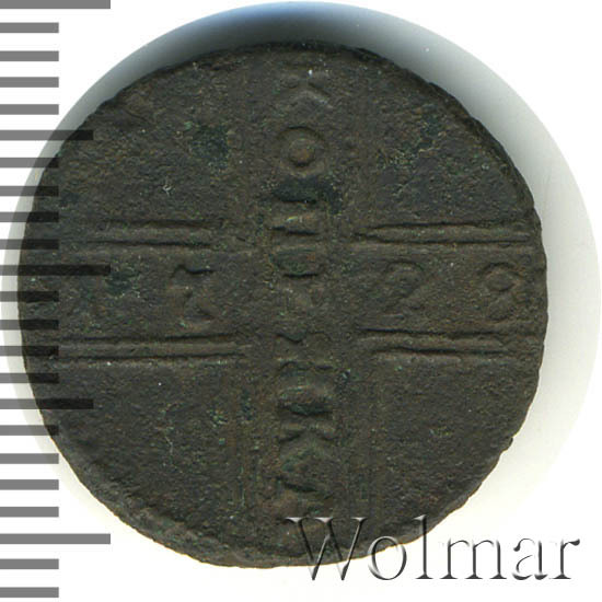Реверс монеты 1 копейка 1728 года большие буквы, год снизу вверх