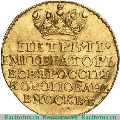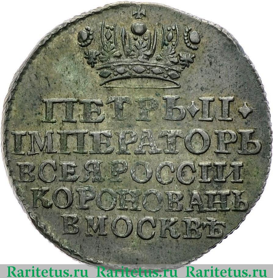 - Реверс: В центре изображена монограмма Петра II, состоящая из четырех перекрещивающихся букв «П», увенчанных коронами. Между буквами — четыре римские цифры «II». Круговая надпись: «МОНЕТА НОВАЯ ЦЕНА РУБЛЬ».
