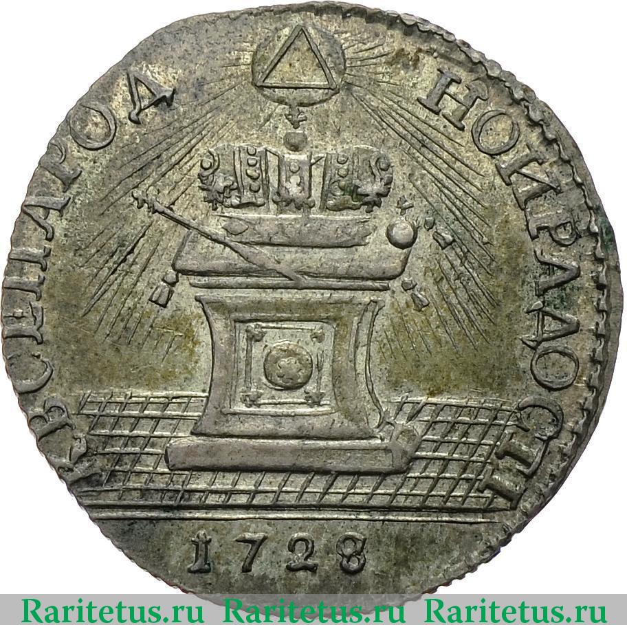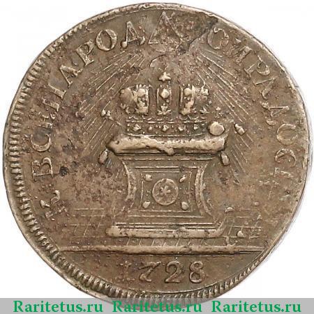 - Реверс: Крестообразно расположенные надписи: номинал — «КОПЕИКА» и год выпуска — «1728». Надписи окантованы двойными линиями.