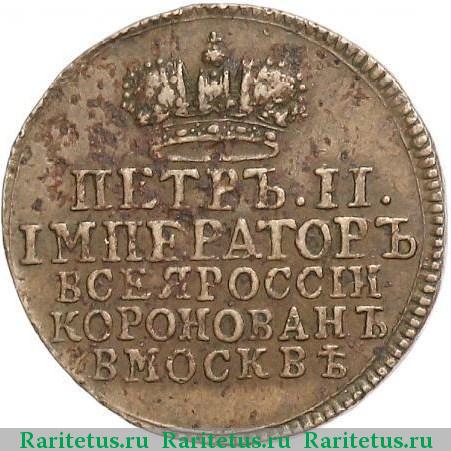 - Аверс: Профильный портрет Петра II вправо с двумя лентами в волосах. В надписи допущена ошибка — «ПЕРТЪ» вместо «ПЕТРЪ».