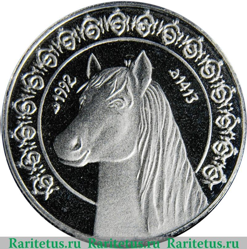 В центре изображение головы лошади. Слева и справа от нее год 1992 по Григорианскому календарю и соответствующий ему 1413 по исламскому календарю. Слева, сверху и справа вдоль канта декоративный элемент, выполненный в национальных алжирских традициях.