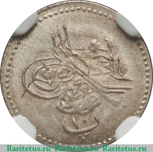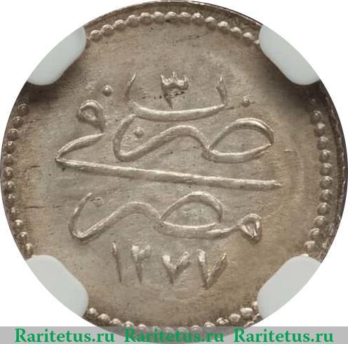 В центре - надпись в 3 строки на османском языке: "ضرب في مصر", что переводится, как: "ВЫПУЩЕНО В ЕГИПТЕ". Снизу - индо-арабскими цифрами: "١٢٧٧" - 1277-й год по исламскому календарю или 1861-й - по григорианскому - время восшествия на престол султана Османской Империи Абдул-Хамида II. Сверху - цифра: "٣" - "3", означающая 3-ий год правления или 1863-ий. По краям канта расположены рельефные элементы в виде зубцов.