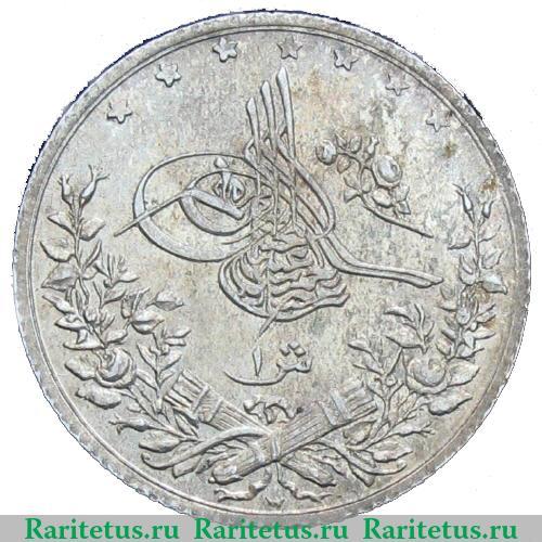 Сверху вдоль канта изображено 7 пятиконечных звёз. В центре изображён персональный знак султана Османской империи Абдул-Хамида II - тугра. Снизу - надпись 1 кирш на османском языке: "۱ش". Снизу вдоль канта изображения кустов роз. По краям канта расположены рельефные элементы в виде зубцов.