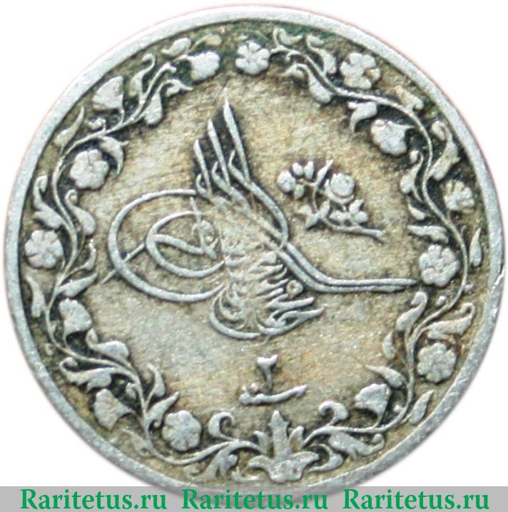 В центре - тугра, справа от неё изображена роза. Снизу - надпись на османском языке: "۲ سنة", что переводится, как: "2-Й ГОД". По краям канта расположены рельефные элементы в виде листьев и цветов.