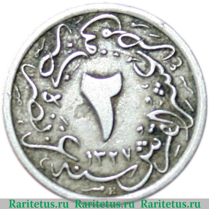 В центре - большая цифра 2: "۲" и надпись: "عشر القرش", что переводится с османского языка, как: "2/10 КИРШЕЙ". Снизу - год восшествия на престол султана Османской Империи Мехмеда V индо-арабскими цифрами: "۱۳۲۷" - 1327-й по исламскому календарю или 1909-й по григорианскому. Вдоль канта надп. на осм. яз.: "ضرب في مصر" - "ПРОИЗВЕДЕНО В ЕГИПТЕ".