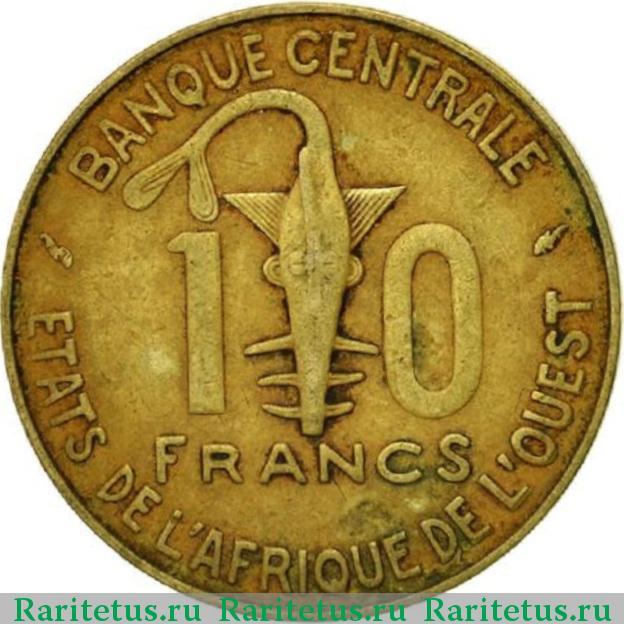 В центре изображена эмблема BCEAO - рыба-пила, делит число «10» на две части, ниже слово «FRANCS» (10 Франков). Сверху вдоль канта надпись - «BANQUE CENTRALE» (ЦЕНТРАЛЬНЫЙ БАНК), снизу - «ETATS DE L'AFRIQUE DE L'OUEST» (ГОСУДАРСТВА ЗАПАДНОЙ АФРИКИ). Надписи отделены друг от друга слева рогом изобилия (знак Парижского монетного двора), справа – дельфином (знак главного гравера Emile Rousseau). Все надписи на французском языке.
