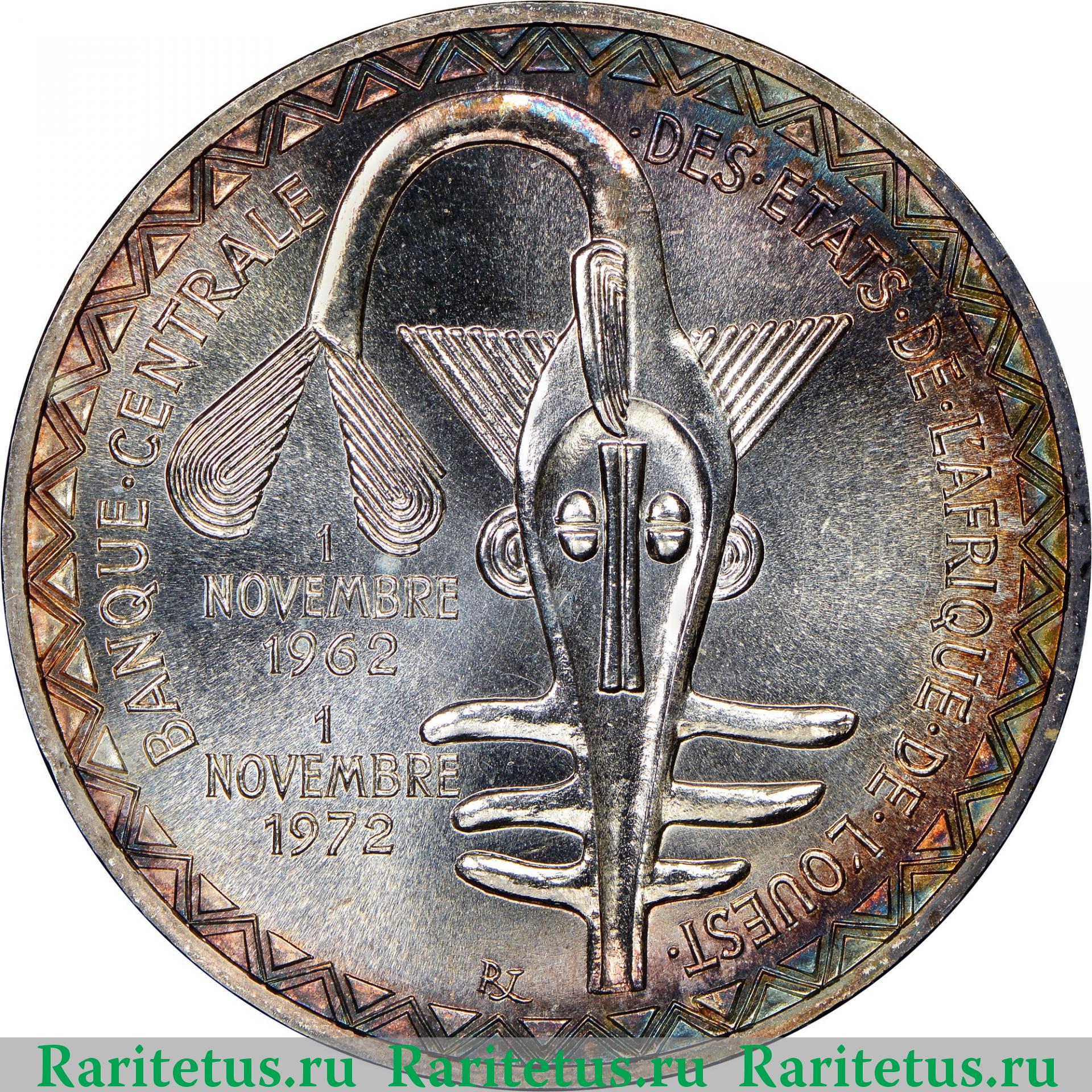 Цена на монету 500 франков (francs) 1972 года Западная Африка (BCEAO) на сегодня, 24 октября 2025 года