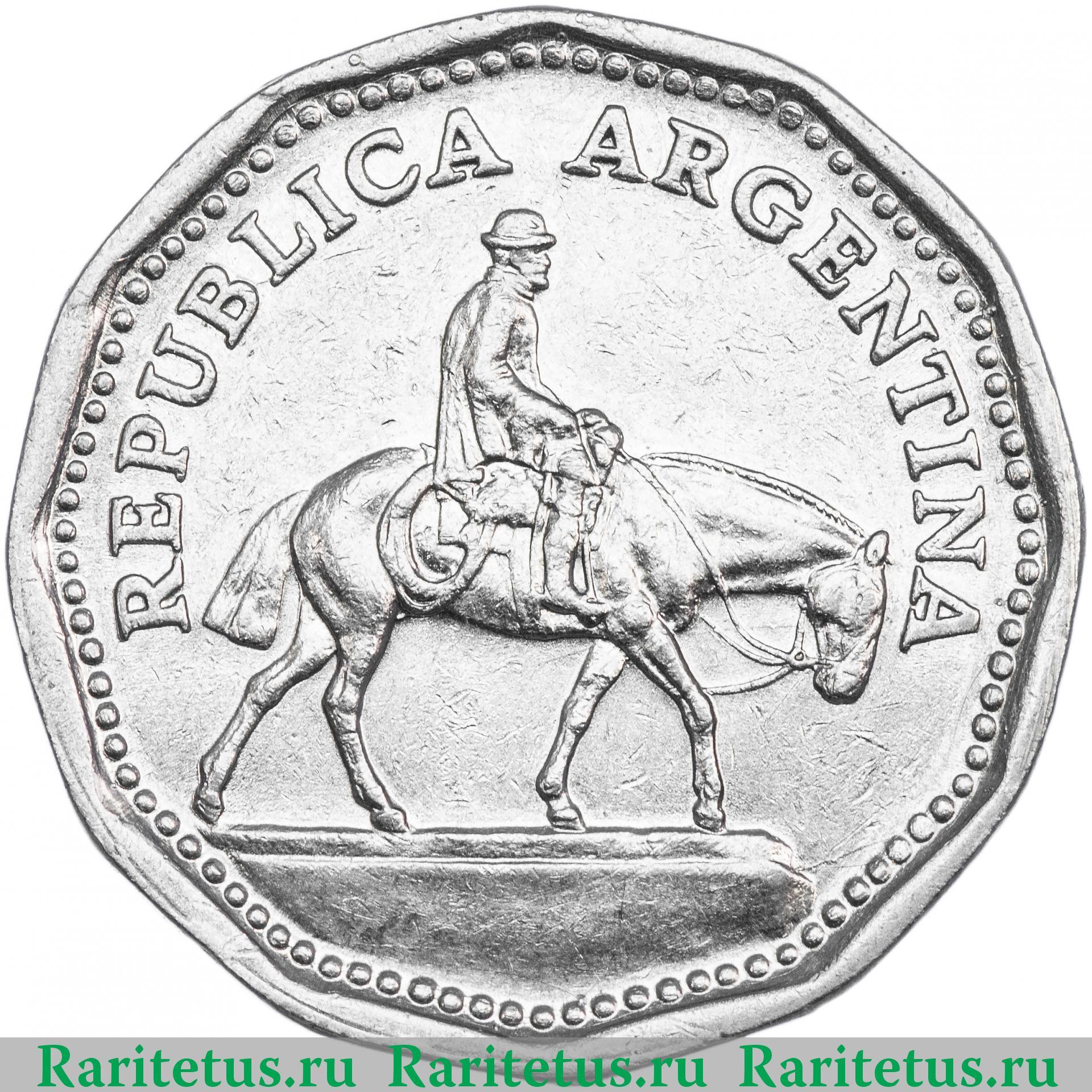 По центру конный памятник «Эль Гаучо Резеро» (человек верхом на лошади вправо). Слева, сверху и справа название страны на испанском языке «REPUBLICA ARGENTINA» (Республика Аргентина). Вдоль канта рельефные элементы в виде точек.