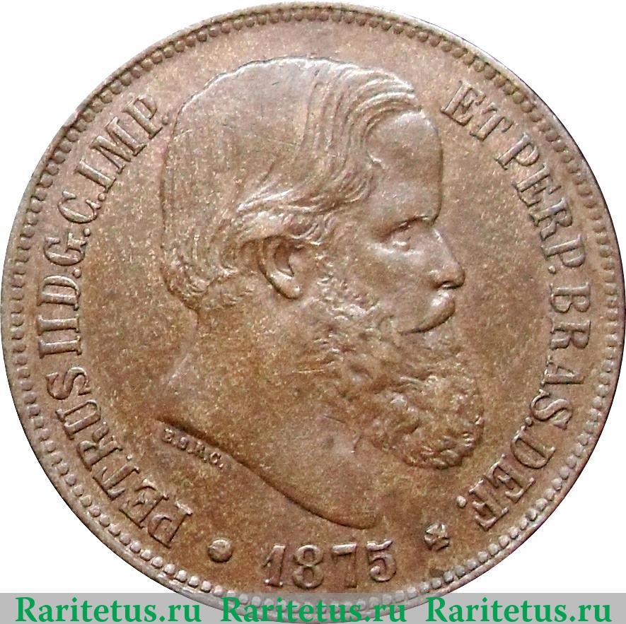 В центре - профильный портрет вправо Педру II. Под обрезом шеи - буквы: "E.S.C.R." - обозначающие инициалы художника, Ernesto de Souza Reis Carvalho. Слева и справа вдоль канта надпись на латинском языке: "PETRUS II D.G.C.IMP. ET PERP.BRAS.DEF" - "ПЕДРУ II БОЖЬЕЙ МИЛОСТЬЮ КОНСТИТУЦИОННЫЙ ИМПЕРАТОР И БЕССМЕННЫЙ ЗАЩИТНИК БРАЗИЛИИ", снизу - год выпуска: "1875". По краям канта расположены рельефные элементы в виде зубцов.