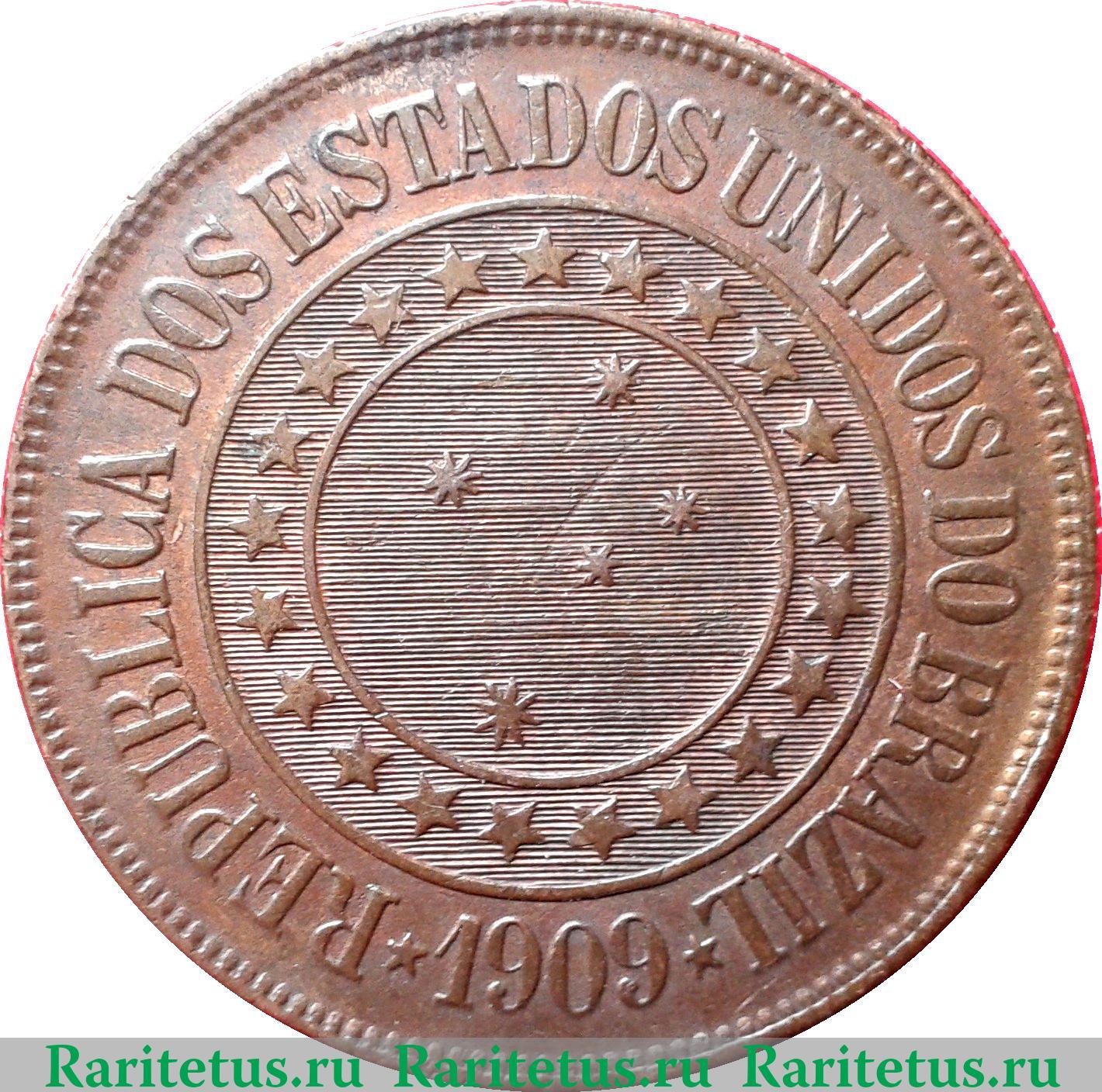 Вдоль канта надпись на португальском языке: "REPUBLICA DOS ESTADOS UNIDOS DO BRASIL" - "РЕСПУБЛИКА СОЕДИНЁННЫХ ШТАТОВ БРАЗИЛИИ". В центре изображены 5 звёзд, символизирующих созвездие Южный Крест. Вокруг них - 21 пятиконечная звезда. Снизу - год выпуска: "1909".