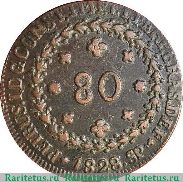 В центре изображён венок из кофейных листьев и плодов. Внутри - число: "80". Вдоль канта надпись на португальском языке: "PETRUS.I.D.G.CONST.IMPET.PERP.BRAS.DEF" - "ПЕДРУ I БОЖЬЕЙ МИЛОСТЬЮ КОНСТИТУЦИОННЫЙ ИМПЕРАТОР И БЕССМЕННЫЙ ЗАЩИТНИК БРАЗИЛИИ", снизу: "1828" - год выпуска. По краям канта расположены рельефные элементы в виде зубцов.