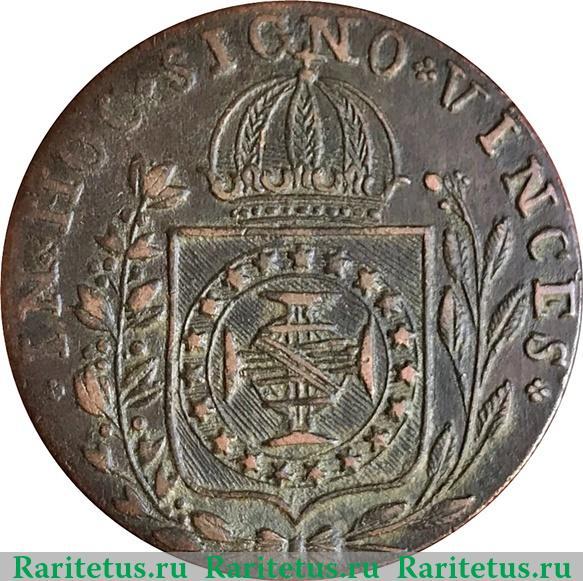 В центре - герб Бразильской Империи, образца 1822 - 1831 годов - щит, над которым корона. Слева вдоль канта изображена кофейная ветвь, справа - табака, которые пересекаются снизу и перевязаны бантом. Сверху, снизу и справа вдоль канта надпись на латинском языке: "IN HOC SIGNO VINCES" - "В ЭТОМ ЗНАКЕ ТВОЯ ПОБЕДА".