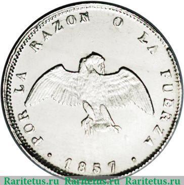 В центре изображён андский кондор с распахнутыми крыльями. Слева, сверху и справа вдоль канта надпись на испанском языке: "POR LA RAZÓN O LA FUERZA" - "РАЗУМОМ ИЛИ СИЛОЙ", снизу - год выпуска: "1857". По краям канта расположены рельефные элементы в виде зубцов.