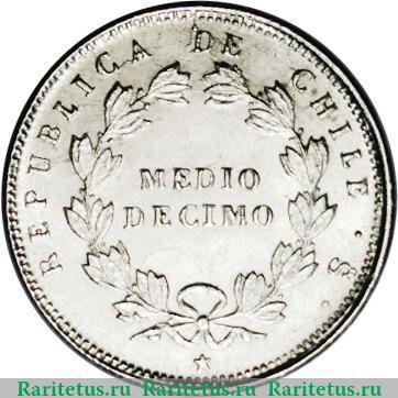 В центре - надпись на испанском языке: "MEDIO DÉCIMO" - "ПОЛОВИНА ДЕСИМО". Вокруг него - венок из лавровых листьев, которые снизу перевязаны бантом. Сверху вдоль канта название страны на исп. яз.: "REPÚBLICA DE CHILE" - "РЕСПУБЛИКА ЧИЛИ". По краям канта расположены рельефные элементы в виде зубцов.