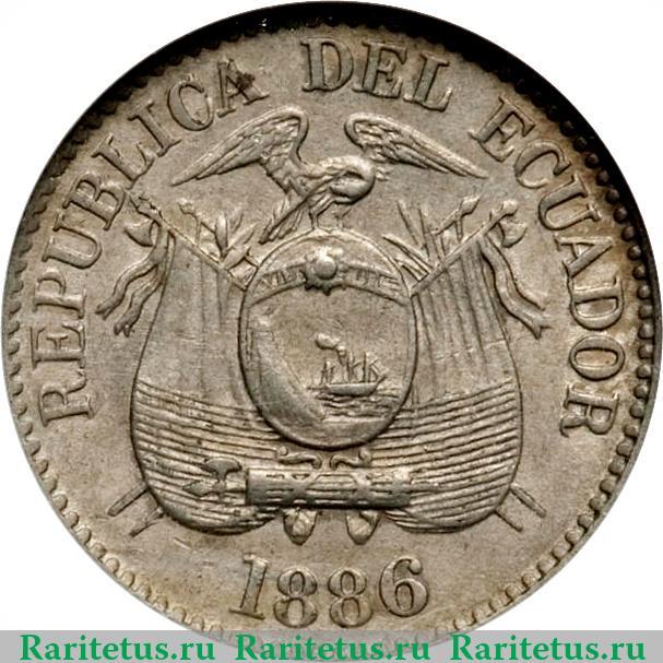 В центре изображен герб Эквадора. Слева, сверху и справа вдоль канта название страны Республика Эквадор на испанском языке: «REPUBLICA DEL ECUADOR». Снизу вдоль канта год выпуска 1886. По окружности канта декоративные элементы в виде зубцов.