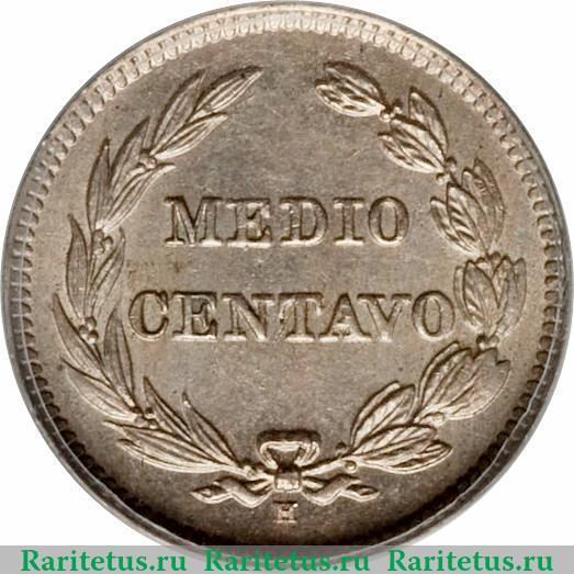 В центре надпись в две строки на исп. яз.: «MEDIO CENTAVO» - половина сентаво, окруженная лавровым венком. Под венком изображена литера «Н» - знак монетного двора Хитона в Бирмингеме (Англия). По окружности канта декоративные элементы в виде зубцов.