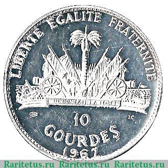В центре изображен герб Республики Гаити. Под ним слева проба серебра в овале, справа монограмма «1С». Ниже надпись полукругом в две строки: «10 GOURDES» - 10 гурдов. Сверху вдоль канта надпись на французском языке: «LIBERTE EGALITE FRATERNITE», которая переводится как: «Свобода. Равенство. Братство». Снизу вдоль канта год выпуска 1967. По окружности канта декоративные элементы в виде точек.