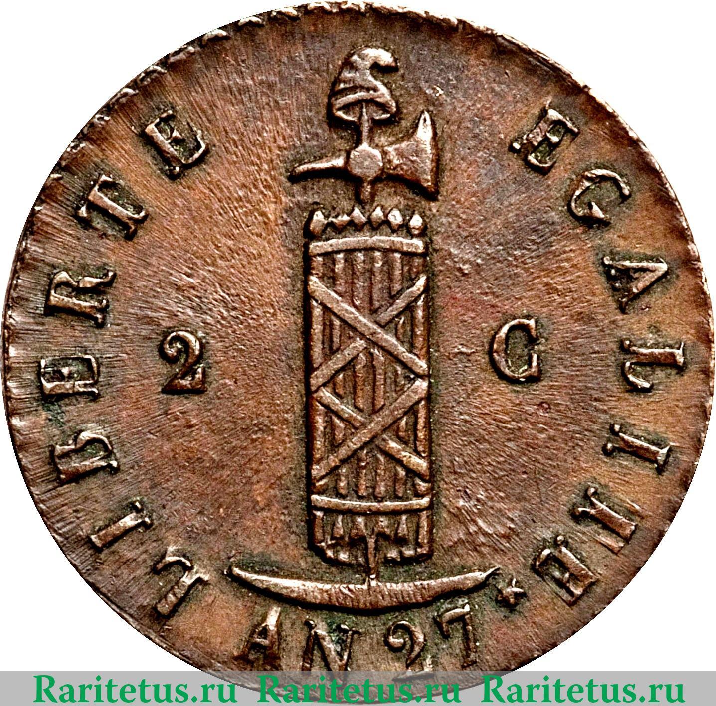 В центре фасции. Слева и справа от них аббревиатура: «2C», которая с французского языка расшифровывается как: 2 сантима. По окружности канта девиз на французском языке: «LIBERTE EGALITE» - Свобода, Равенство и надпись: «AN27». По окружности канта рельефные элементы, выполненные в виде зубцов.