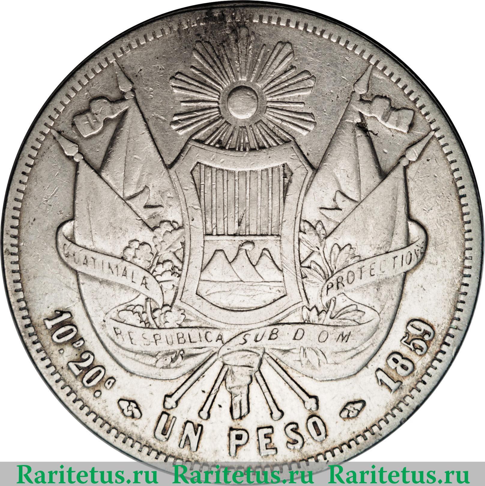 В центре герб Гватемалы. Под ним надпись на исп.яз.: «UN PESO» - один песо, год выпуска: 1859 и проба серебра: «10D.20G». Вдоль канта - зубчатый рельеф.