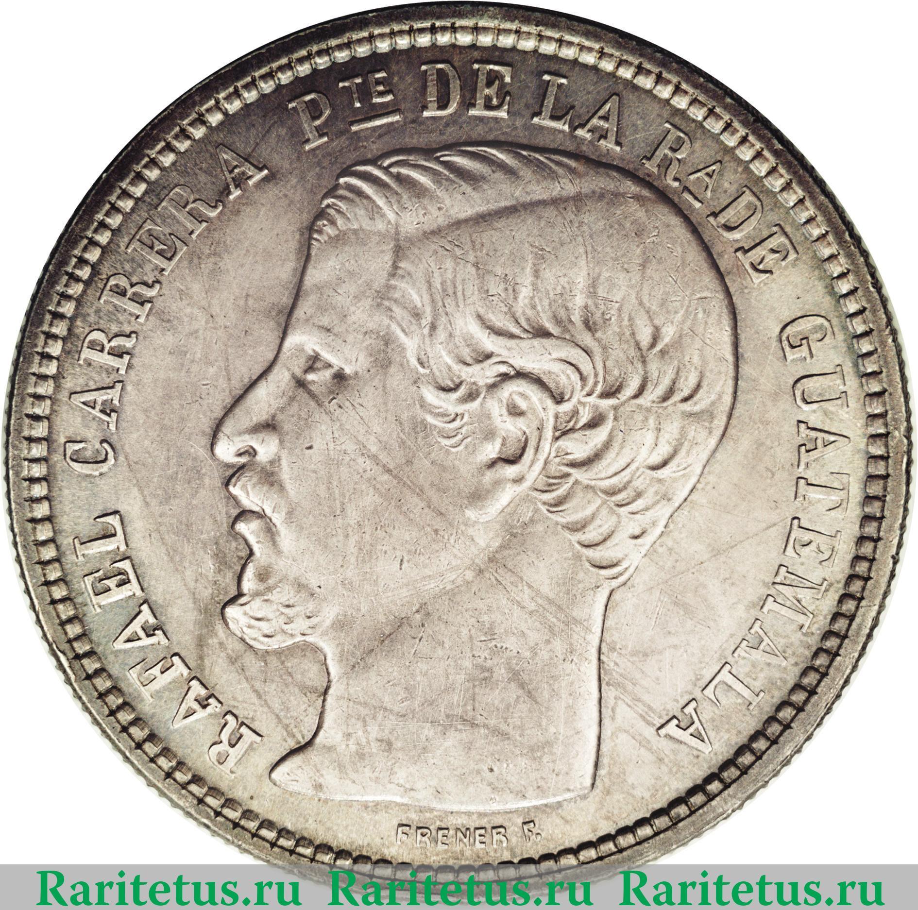 В центре профильный портрет влево Рафаэля Карреры. В обрезе шеи литера «FRENER F.» - знак гравёра Жана-Баптиста Френера. По окружности канта надпись на испанском языке: «RAFAEL CARRERA PE. DE LA RA. DE GUATEMALA» - Рафаэль Каррера президент Республики Гватемала. По окружности канта рельефные элементы, выполненные в виде зубцов.