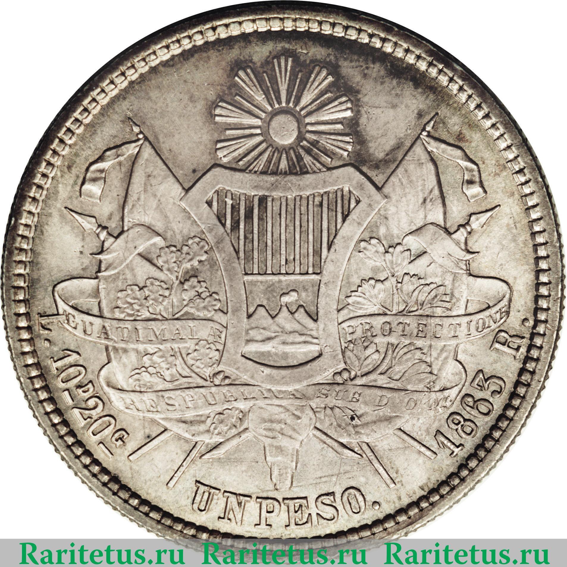 В центре герб Гватемалы. Под ним надпись на исп.яз.: «UN PESO» - один песо, год выпуска: «1863 R.» - 1863 год и проба серебра: «10D.20G». Вдоль канта - зубчатый рельеф.