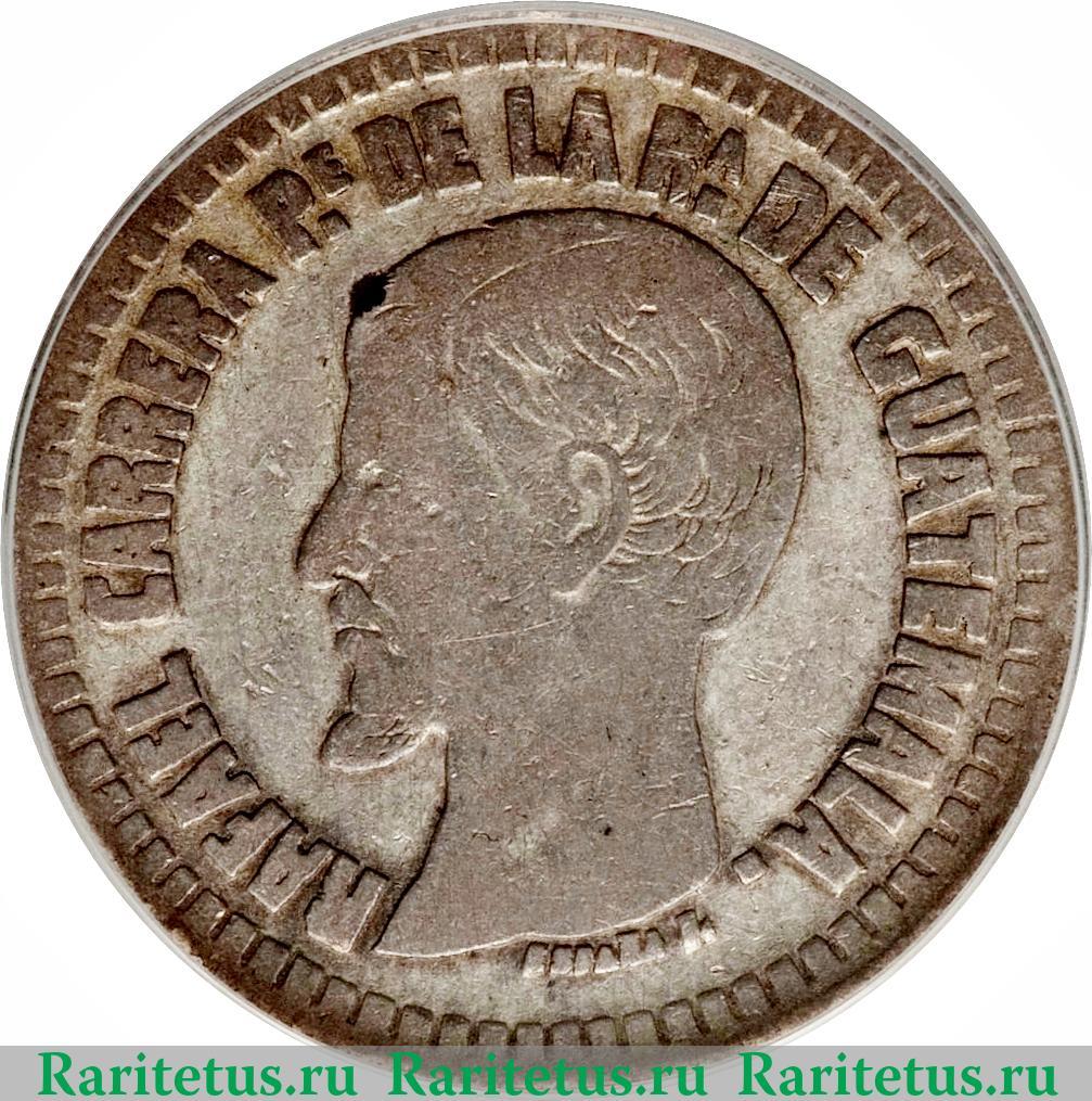 В центре профильный портрет влево Рафаэля Карреры. В обрезе шеи литера «FRENER F.» - знак гравёра Жана-Баптиста Френера. По окружности канта надпись на испанском языке: «RAFAEL CARRERA PE. DE LA RA. DE GUATEMALA» - Рафаэль Каррера основатель и президент Республики Гватемала. По окружности канта рельефные элементы, выполненные в виде зубцов.