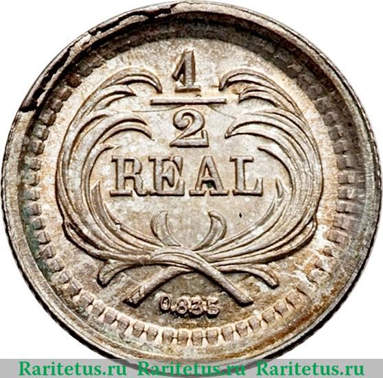 В центре, в венке из листьев, надпись на испанском языке в 2 строки: «1/2 REAL» - 1/2 реала. Под ним масса серебра: 0,835. Вдоль канта - зубчатый рельеф.