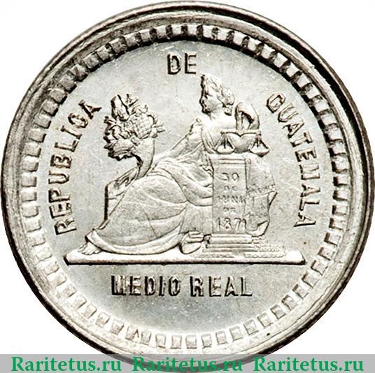 В центре изображение сидящей Фемиды, держащей в левой руке весы, в правой - рог изобилия. Справа от неё колонна, символизирующая конституцию с надписью на испан.яз. в 5 строк: «30 DE JUNIO DE 1871» - 30 июня 1871 года. Под ней надпись на испанском языке: «MEDIO REAL» - половина реала. Слева, сверху и справа вдоль канта название страны на испан.яз.: «REPUBLICA DE GUATEMALA» - Республика Гватемала. Вдоль канта - зубчатый рельеф.