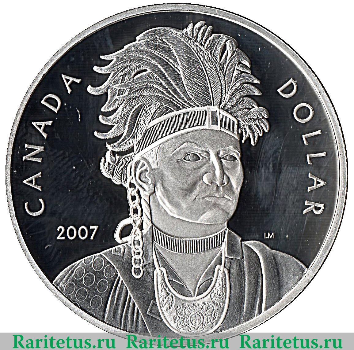 В центре изображение индейца в национальном костюме. Над правым плечом мужчины дата 2007, над левым монограмма «ML» - знак гравера Лори Макгоу (Laurie McGaw). Слева вдоль канта надпись: «CANADA» - название страны Канада на англ. яз., справа «DOLLAR» - «1 доллар».