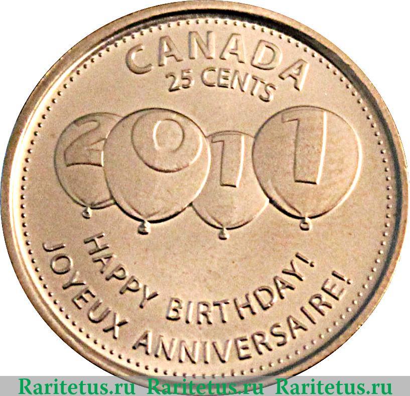 По центру изображены в ряд четыре воздушных шара, на каждом шаре по одной цифре 2011 года. Сверху по окружности канта надписи на английском языке: название страны «CANADA» (Канада) под ней надпись «25 CENTS» (25 Центов). Снизу надпись «С днем рождения!» на двух языках: вдоль канта на французском «JOYEUX ANNIVERSAIRE!» над ней на английском «HAPPY BIRTHDAY!». Вдоль канта точки.