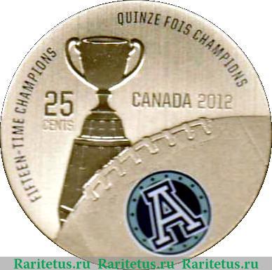 По центру изображен силуэт кубка Грея. Снизу фрагмент овального мяча со шнуровкой, используемого для игры в канадский футбол. На мяче логотип профессиональной канадской футбольной команды – «Toronto Argonauts». По обе стороны от кубка надписи на английском языке: слева «25 CENTS» (25 Центов), справа название страны «CANADA» (Канада) и год выпуска «2012». Вдоль канта надпись «Пятнадцатикратные чемпионы» на двух языках: слева на английском «FIFTEEN-TIME CHAMPIONS», сверху на французском «QUINZE FOIS CHAMPIONS».