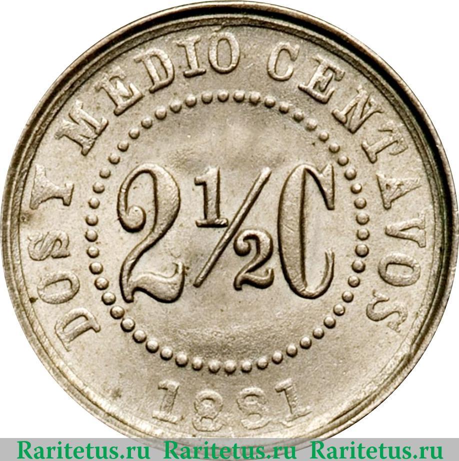 В центре, внутри окружности, образованной точками, надпись: «2 ½ C» - 2 ½ сентаво. Слева, сверху и снизу вдоль канта надпись на испанском языке: «DOSY MEDIO CENTAVOS» - два с половиной сентаво. Снизу вдоль канта дата выпуска -1881. Вдоль канта расположена окружность меньшего диаметра.