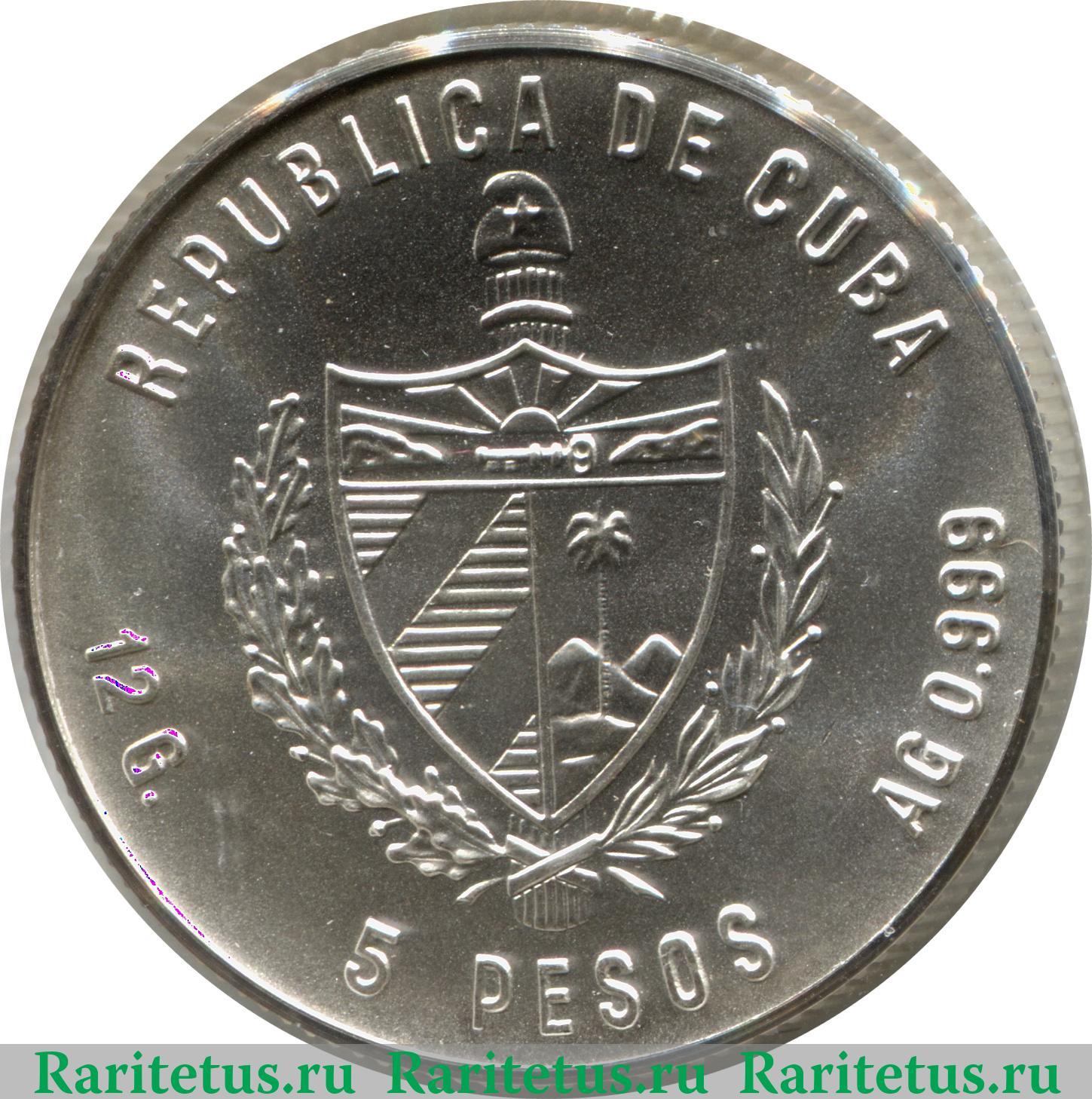 В центре герб Кубы. Сверху вдоль канта название страны на испан.яз.: «REPUBLICA DE CUBA» - Республика Куба, снизу - «CINCO PESOS» - пять песо. Справа возле канта проба серебра: «AG.0999», слева масса - «12.6.».