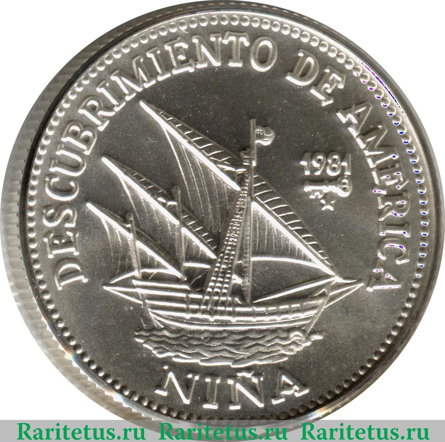 В центре изображение парусника Нинья под парусами. Сверху и справа от него год выпуска: 1981, под ним литеры: ключ и пятиконечная звезда. Слева, сверху и справа вдоль канта надпись на испанском языке: «DESCUBRIMIENTO DE AMERICA» - открытие Америки, снизу - «NIÑA» - Нинья. По окружности канта рельефные элементы, выполненные в виде точек.