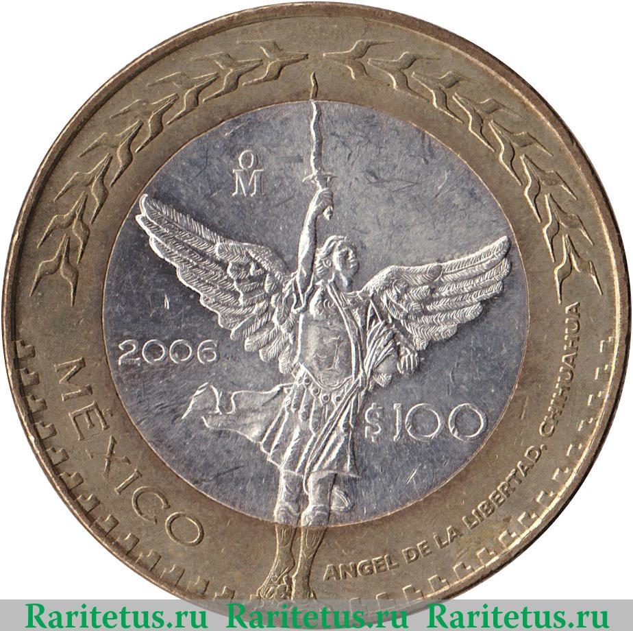 В центре изображение ангела с поднятым в правой руке мечом. Справа от него надпись: «$100» - 100 песо, слева - год выпуска 2006, над ним знак монетного двора в Мехико. Слева вдоль канта надпись на испан. языке: «MEXICO» - «Мексика». Снизу и справа вдоль канта надпись на исп. яз.: «ANGEL DE LA LIBERTAD.CHIHUAHUA», в переводе: «Ангел свободы. Штат Чиуауа». По окружности канта (зеркально отраженные по вертикали) декоративные элементы: сверху в виде восьми летящих птиц, снизу - пятнадцати ступеней.