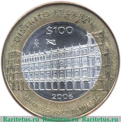 В центре изображение здания ратуши старого федерального округа в г. Мехико (Old Federal District Building). Над зданием надпись: «$100» - 100 песо, слева над ратушей знак монетного двора в Мехико. Под зданием год выпуска 2006. Сверху вдоль канта надпись на исп. яз.: «DISTRITO FEDERAL», которая переводится как: «Федеральный округ». Снизу вдоль канта надпись на исп. языке: «ANTIGUO AYUNTAMIENTO», в переводе: «Старый городской зал».
