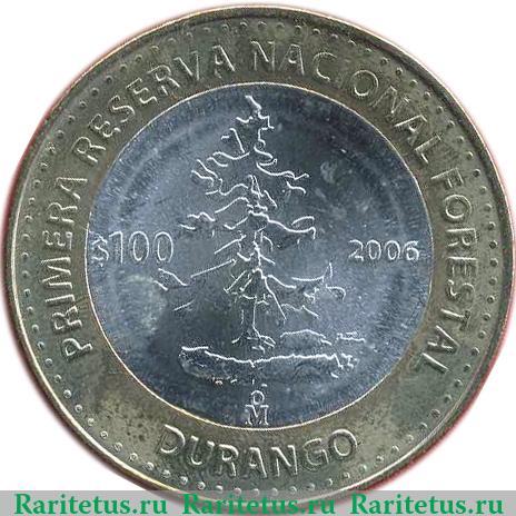 В центре изображение хвойного дерева, справа от него год выпуска 2006, слева надпись: «$100» - 100 песо, снизу знак монетного двора в Мехико. Сверху вдоль канта надпись на исп. языке: «PRIMERA RESERVA NACIONAL FORESTAL», которая переводится как: «Первый национальный лесной резерв». Снизу вдоль канта надпись на исп. яз.: «DURANGO», в переводе: «Штат Дуранго».