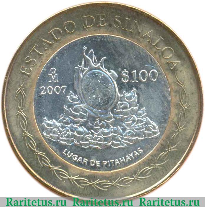 В центре круге из серебристого металла изображение плода питахайя. Под ним надпись на исп. языке: «LUGAR DE PITAHAYAS», которая переводится как: «Место питахайя». Слева от плода знак монетного двора в Мехико. И год выпуска 2007. Справа надпись: «$100» - 100 песо. Сверху вдоль канта канта название штата Синалоа на исп. языке: «ESTADO DE SUNALOA». На свободном от надписи месте внешнего кольца из желтого металла декоративное изображение в виде перекрещивающихся кривых.
