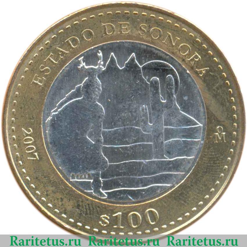 В центре круге из серебристого металла контурное ростовое изображение человека в национальном индейском одеянии. Справа от него пустынный пейзаж: кактус, гора и выглядывающее из-за горы солнце. Вдоль канта расположены надписи: слева год выпуска 2007; знак монетного двора в Мехико; снизу «$100» - 100 песо; сверху название штата Сонора на исп. языке: «ESTADA DE SONORA». По окружности канта расположены декоративные элемент в виде горизонтальных черточек.