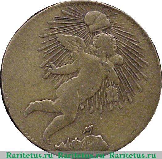В центре изображение летящего над землей ангелочка, над его головой, излучающий свет, колпак богини Свободы. По окружности канта декоративные элементы в форме зубцов.