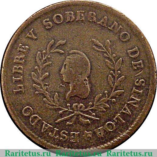 Соединенные Мексиканские Штаты (с 1810 г. по н/вр.), Мексиканская Республика (1824-1864 гг.), штат Синалоа, глава: до 21.03.1847 г. президент Валентин Гомес Фарриас, 21.03-02.04 и 20.05-15.09 президент Антонио Лопес да Санта-Анна, 02.04-20.05 и с 13.11.1847 г. президент Педро Мария да Анайя, 26.09-13.11 президент Мануэль да ла Пенья-и-Пенья. Монетный двор г. Синалоа (Мексика). Регулярный выпуск.