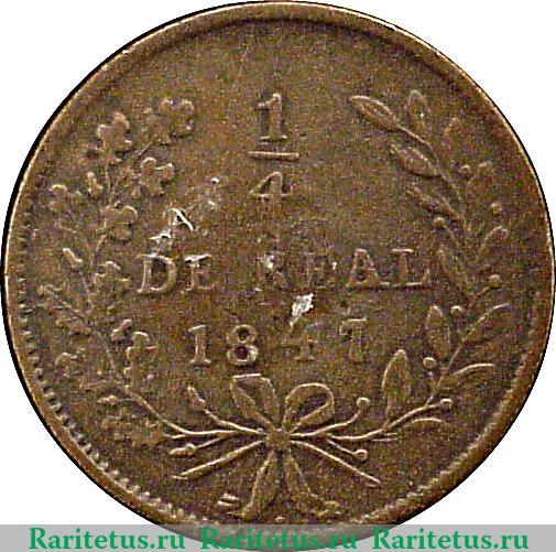 В центре, в окружении изображения венка из дубовых и лавровых листьев, перевязанного лентой, надпись в четыре строки: число «1/4 DE REAL» - 1/4 реала и год выпуска 1847. По окружности канта декоративные элементы в виде зубцов.