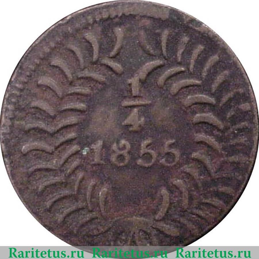 В центре, в окружении стилизованного изображения венка из длинных листьев, число «1/4» - 1/4 (реала) и год выпуска 1855. По окружности канта декоративные элементы в виде зубцов.