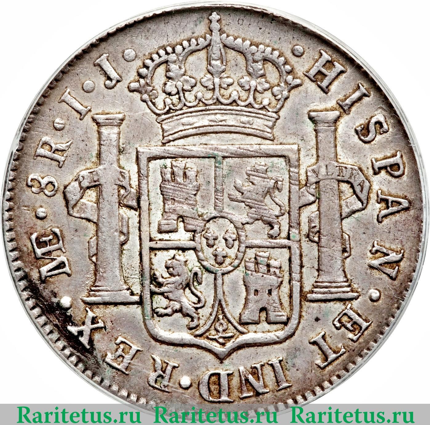 В центре, в колоннах, изображён герб Перу, увенчанный короной. Слева, снизу и справа вдоль канта надписи на латин. яз.: «HISPAN ET IND REX», «8 R» - король Испании и Индии, 8 реалов, разделённая точками и литеры «MÆ» и «IJ», принадлежащие монетному двору г. Лима. Вдоль канта - зубчатый рельеф.