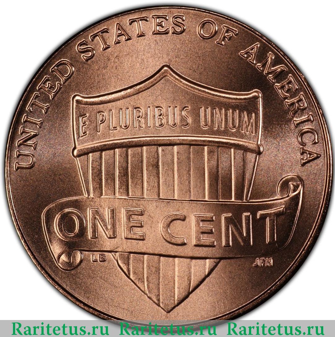 В центре изображён щит с 13 вертикальными полосами, символизирующий государственное и национальное единство. Надписи: UNITED STATES OF AMERICA / E PLURIBUS UNUM / ONE CENT / LB / JFM.