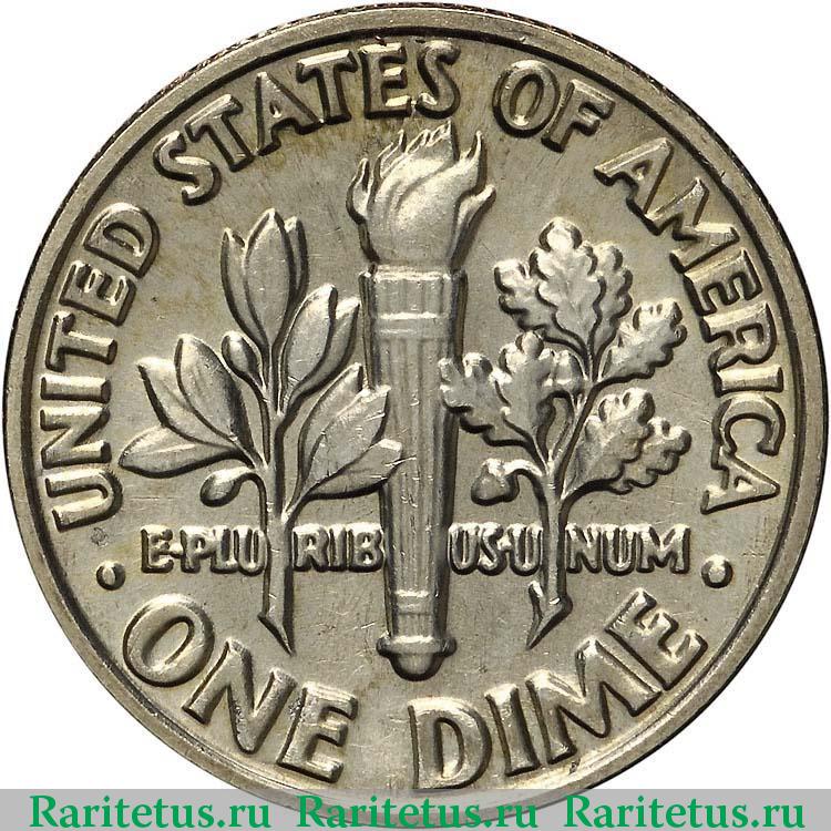 В центре изображены: оливковая ветвь, факел и дубовая ветвь, символизирующие соответственно: мир, свободу и победу. Надписи: E • PLU RIB US • U NUM / UNITED STATES OF AMERICA / • ONE DIME •.