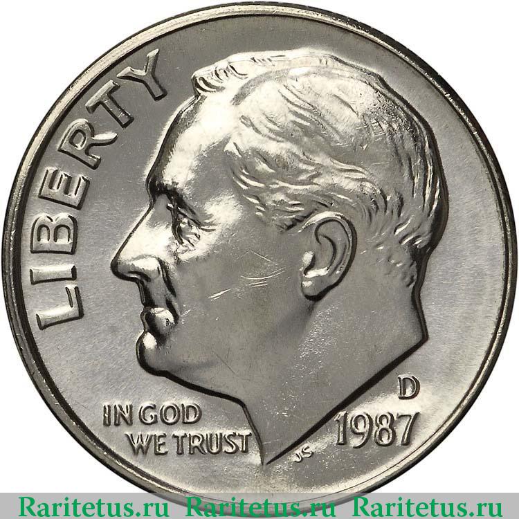 Аверс монеты 10 центов (one dime) 1987 года D США