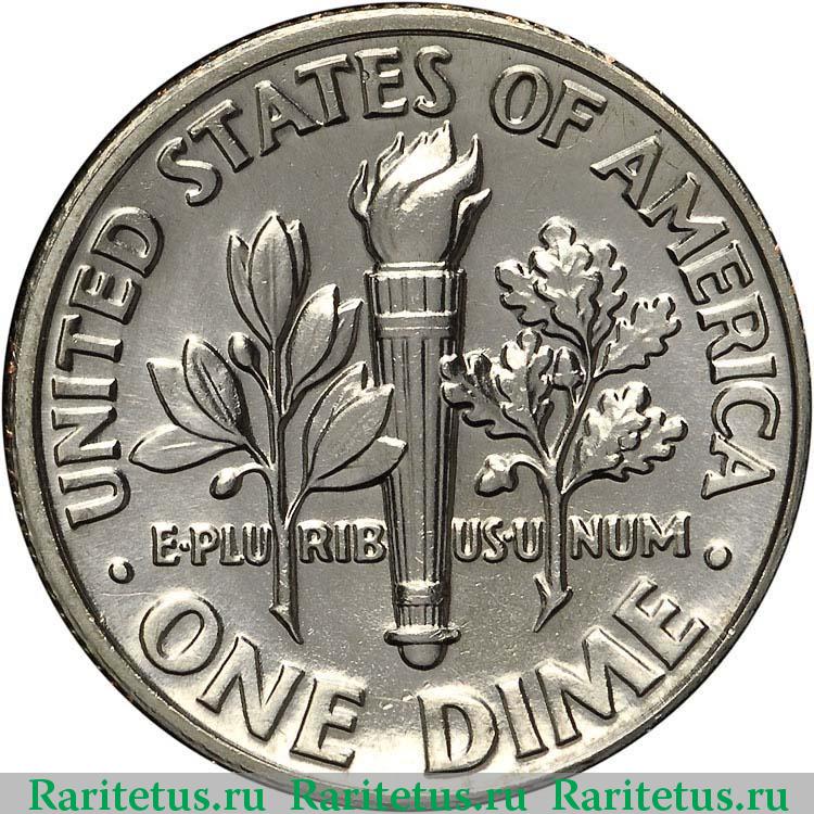 В центре изображены: оливковая ветвь, факел и дубовая ветвь, символизирующие соответственно: мир, свободу и победу. Надписи: E • PLU RIB US • U NUM / UNITED STATES OF AMERICA / • ONE DIME •.