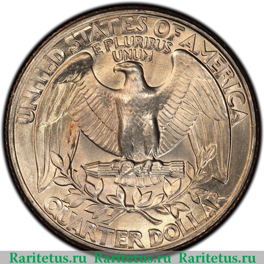 Изображён белоголовый орлан — геральдический символ США. Надписи: UNITED STATES OF AMERICA / E PLURIBUS UNUM / QUARTER DOLLAR.