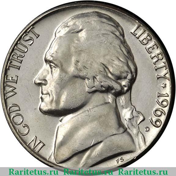 Портрет влево Томаса Джефферсона, 3-го президента Соединенных Штатов (1801-1809 гг.). Надписи: IN GOD WE TRUST /Liberty / * / 1969 / FS.